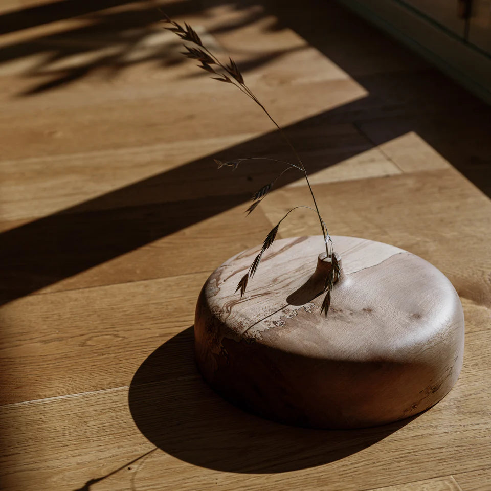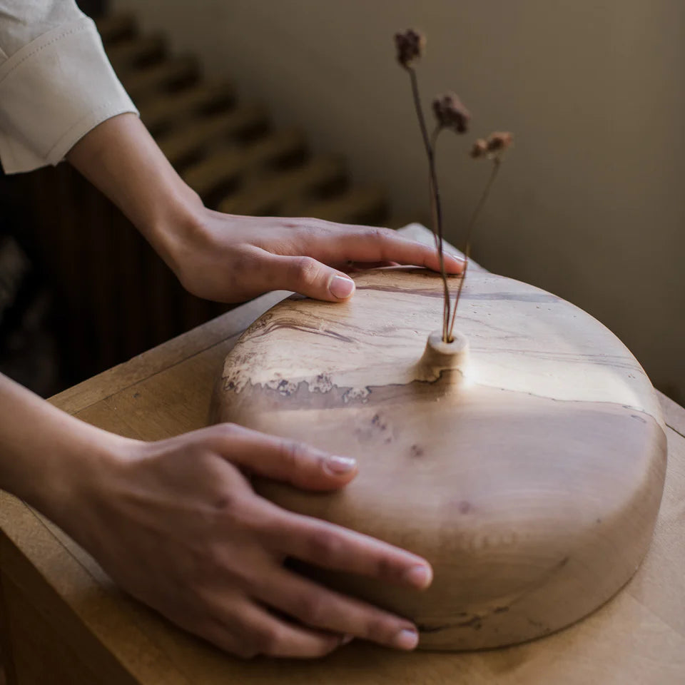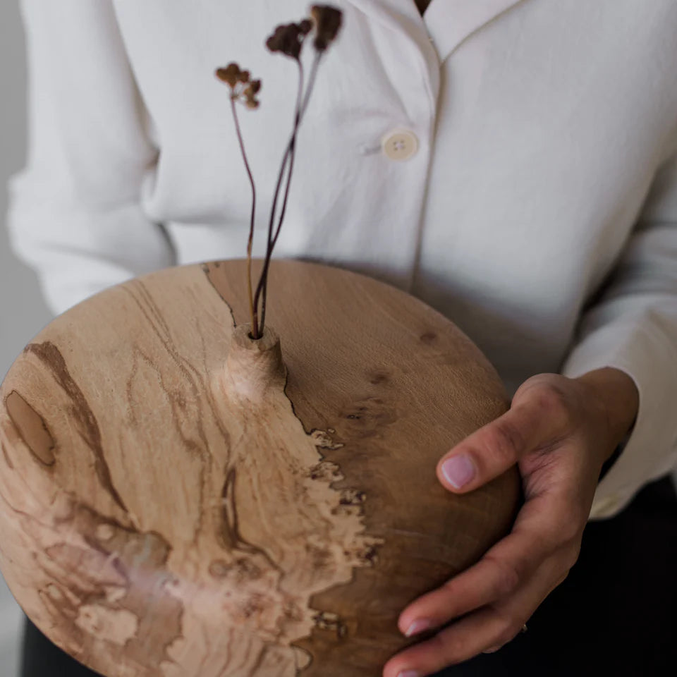 For Whirl & Whittle’s debut studio collection, Your Scars Are Beautiful, the Ottawa-based designer consciously chose unpredictable wood pieces — such as spalted beech. Spalting is a form of wood coloration caused by fungi. It predominantly occurs in dead trees but can also occur in living trees undergoing stress. Spalting causes weight loss and strength loss in the wood and yet is sought by woodworkers.