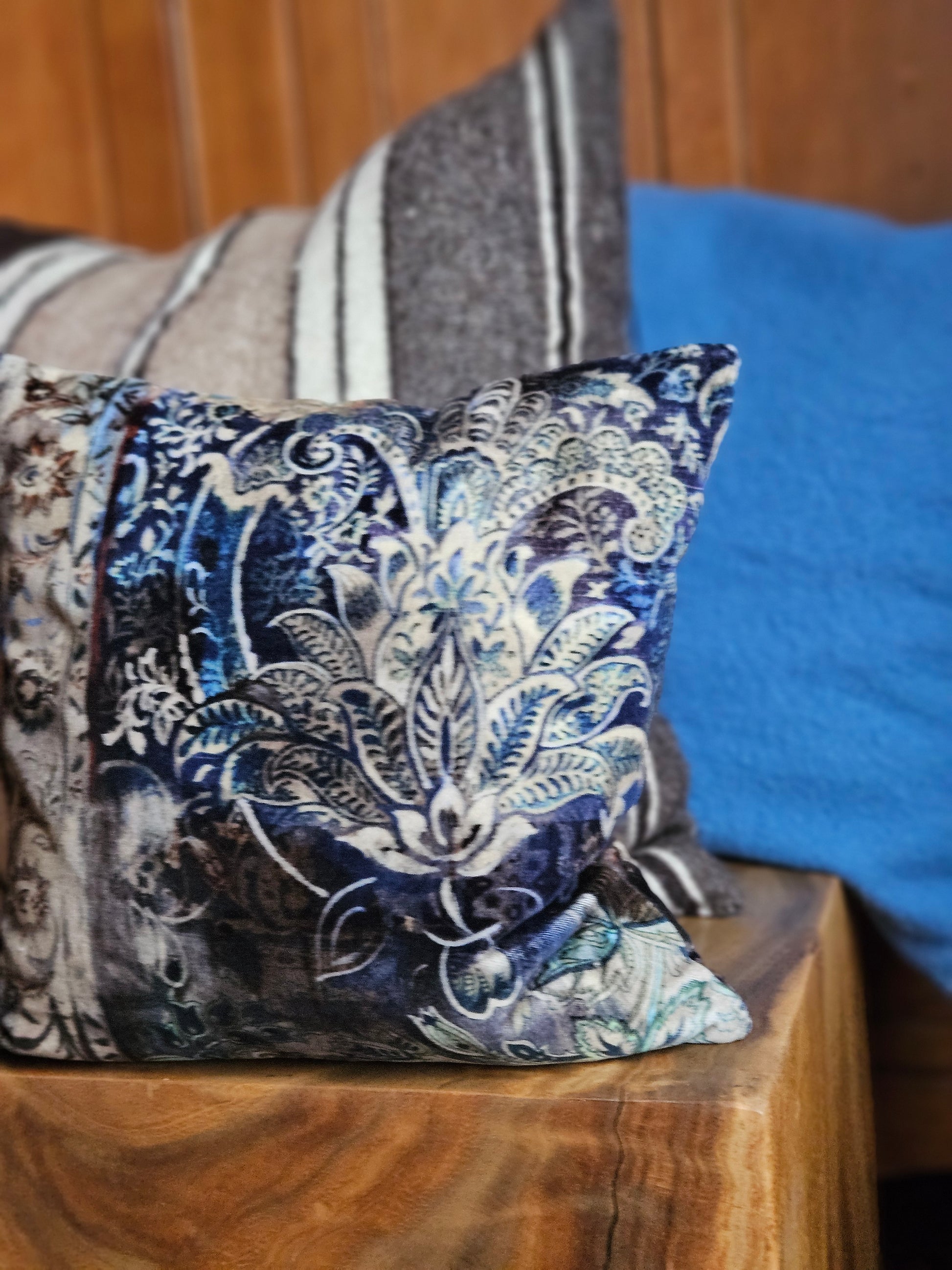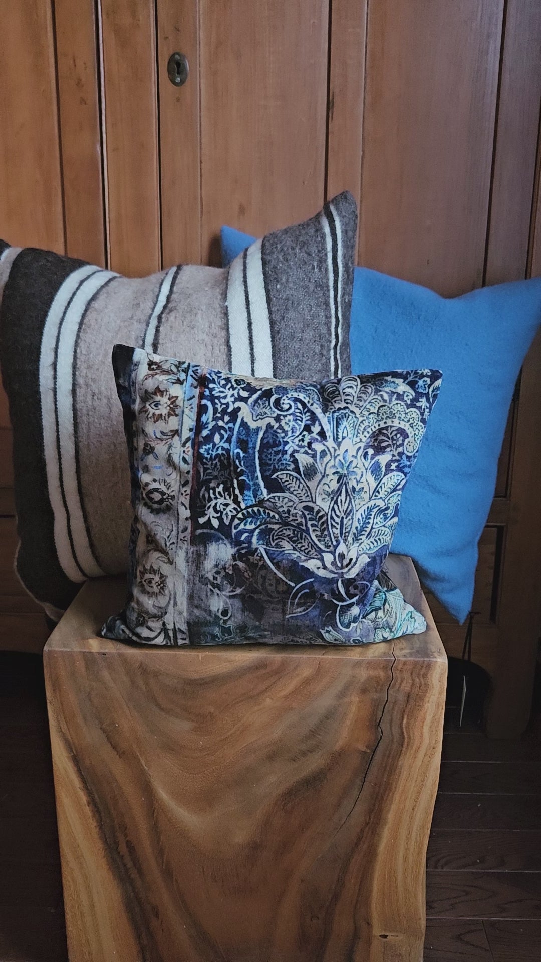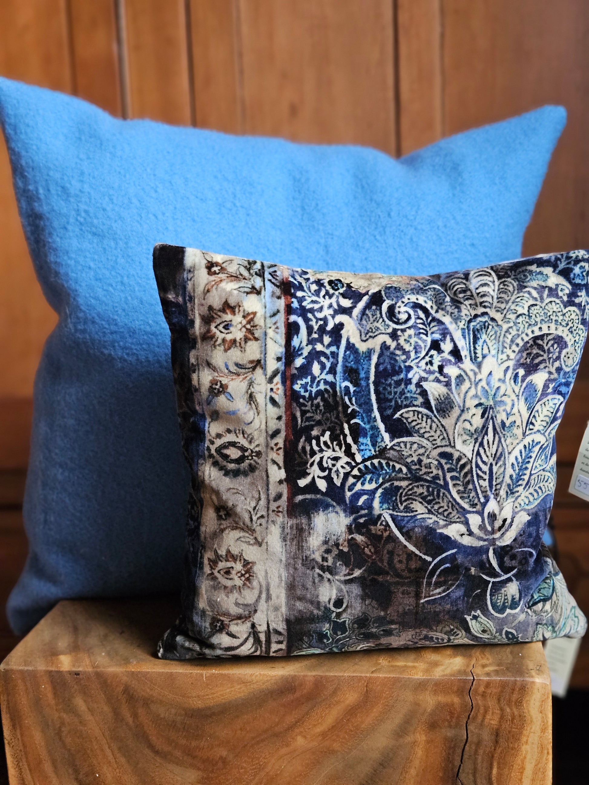 Size: 3 cushions, 20'' x 20'' , 20'' x 20'' , 12'' x 12'' . Wool and velvet cushions with zipper and down inserts.